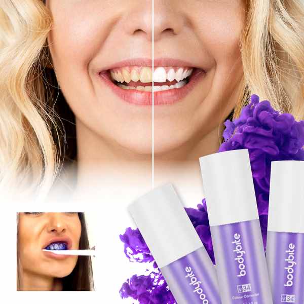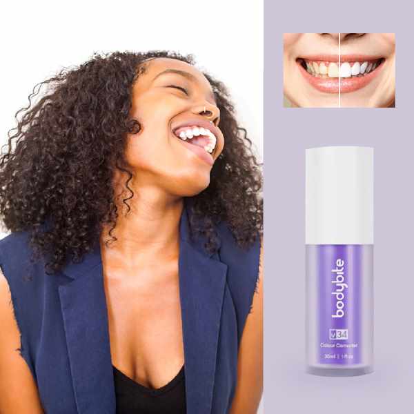 V34 utilise une technologie de correction de couleur pour améliorer visiblement la luminosité de votre sourire. Parce que le violet est la couleur complémentaire du jaune, la formule aide à équilibrer les tons jaunes indésirables pour une apparence plus uniforme et radieuse. Le résultat est un sourire à l’apparence instantanément plus fraîche — sans traitements agressifs ni étapes compliquées.